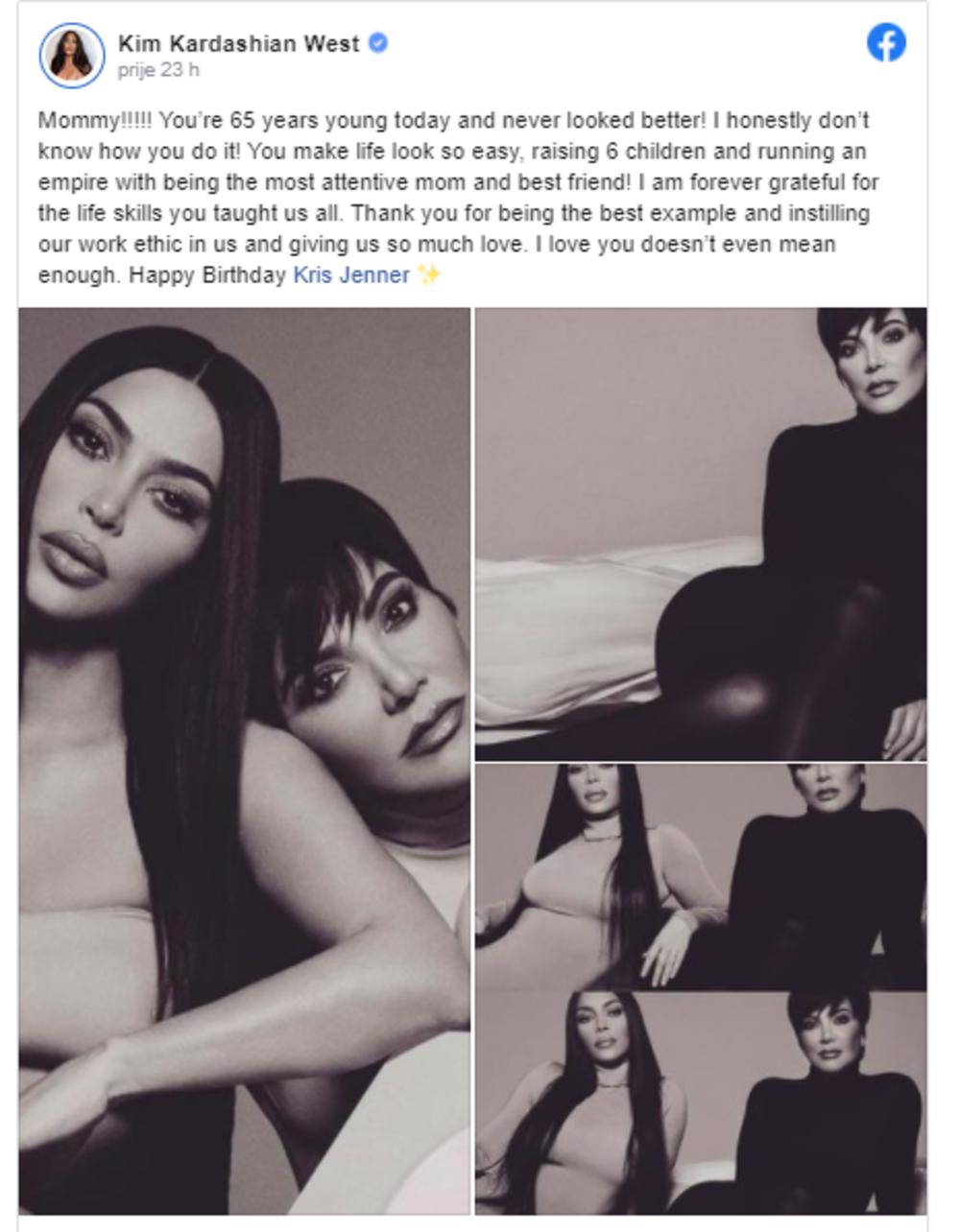 - Mama, danas puniš 65 godina i nikada nisi izgledala bolje! Iskreno ne znam kako to uspevaš! Činiš da život izgleda tako lako, podižeš šestoro dece i vodiš carstvo sa najpažljivijom mamom i najboljom prijateljicom! Zauvek sam zahvalan na životnim veštinama kojima si me sve naučila. Hvala što si najbolji primer i što si nam usadila radnu etiku i pružila nam toliko ljubavi. Volim te ni ne znači dovoljno. Srećan rođendan - napisala je Kim Kardašijan, dok su mnogi prokomentarisali da Kris izgleda mlađe od ćerke.