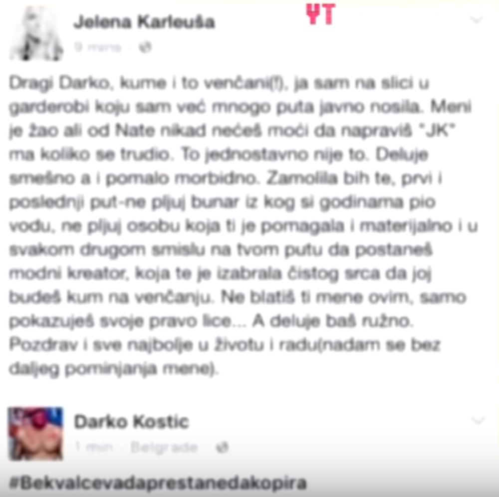 A bivši kum, Darko Kostić je, podsetimo, optužio da kopira Natašu Bekvalac nakon čega je Diva napisala opširniji status upućen njemu, ali ga je ubrzo obrisala.
