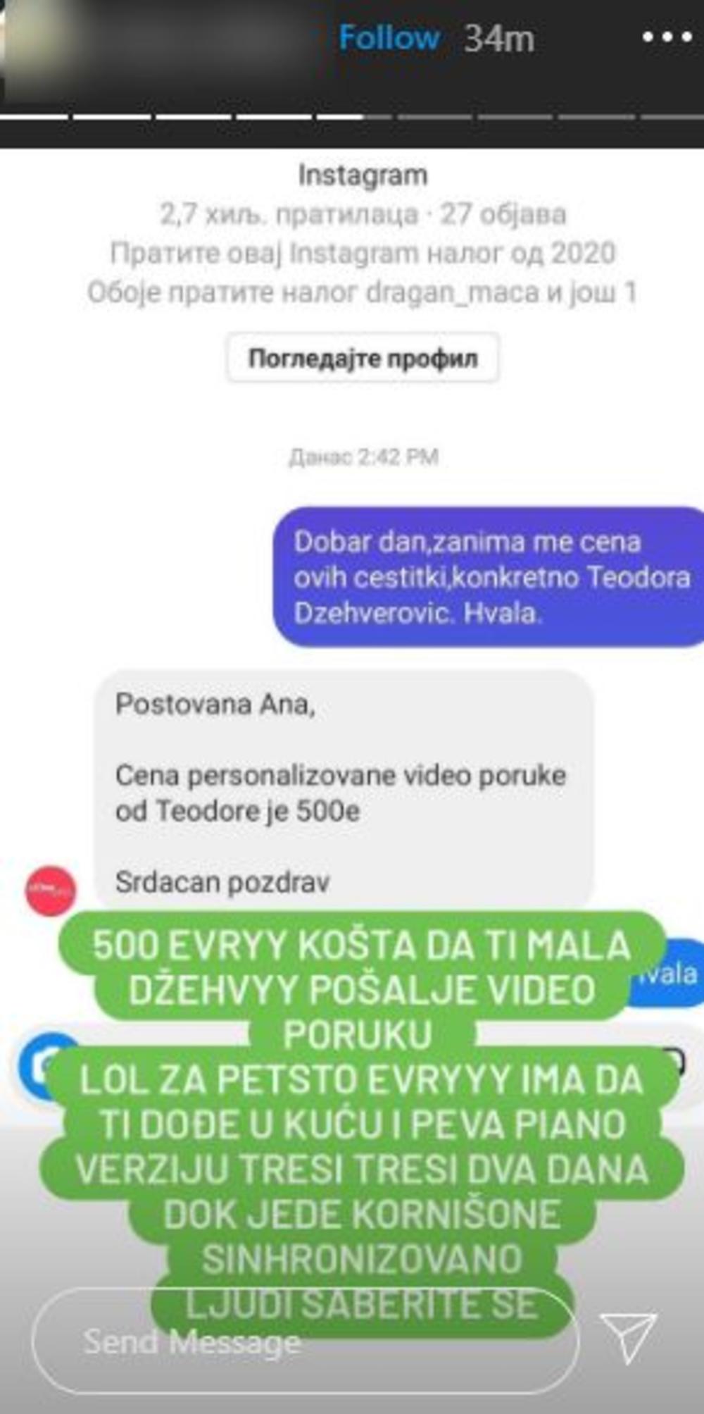 Verovali ili ne da vam se Teodora obrati u nekoliko reči na vaš važan dan košta basnoslovnih 500 evra. To je objavljeno na storiju jedne Instagram stranice.