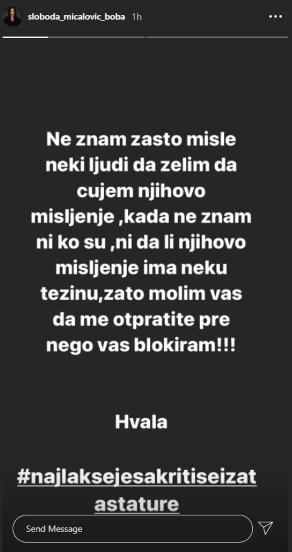 - Ne znam zašto neki ljudi misle, da želim da čujem njihovo mišljenje, kada ne znam ni ko su, ni da li njihovo mišljenje ima neku težinu. Zato molim vas da me otpratite, pre nego što vas blokiram. Hvala - napisala je glumica u svom obraćanju.
