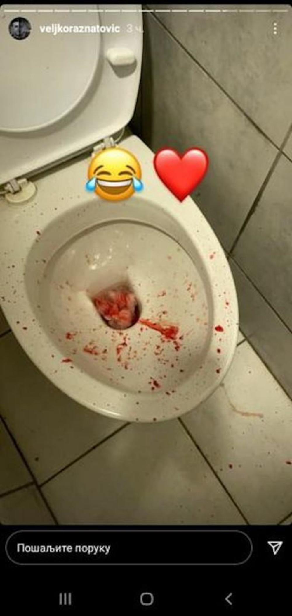 On je uslikao wc šolju koja je isprskana krvlju, što je verovatno posledica jakih udaraca suparnika na treningu, međutim, Ražnatović je na fotku stavio emotikon koji se smeje i srce, što bi verovatno značilo da nije toliko strašno kao što izgleda na spornoj slici.