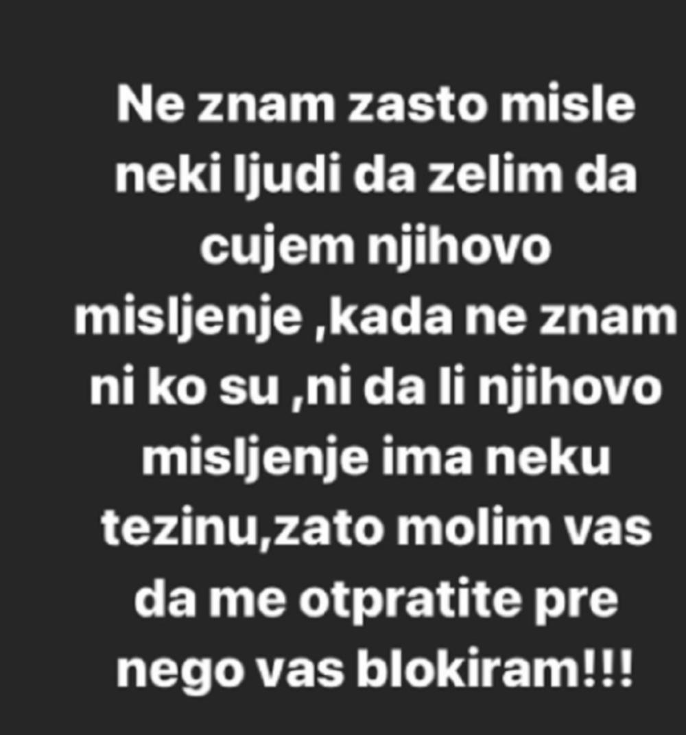 - Ne znam zašto neki ljudi misle da želim da čujem njihovo mišljenje, kada ne znam ni ko su, ni da li njihovo mišljenje ima neku težinu. Zato molim vas da me otpratite pre nego što vas blokiram - napisala je Sloboda.