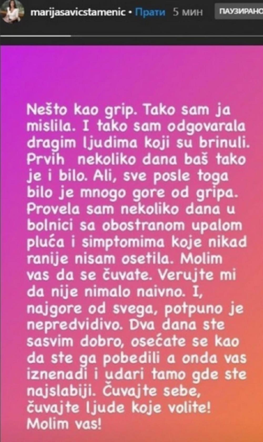 - Verujte mi da nije nimalo naivno. I najgore od svega, potpuno je nepredvidivo. Dva dana si sasvim dobro, osećate se kao da ste ga pobedili, a onda vas iznenadi i udari tamo gde ste bili najslabiji. Čuvajte sebe, čuvajte ljude koje volite! Molim vas! - napisala je Marija na pomenutoj društvenoj mreži.