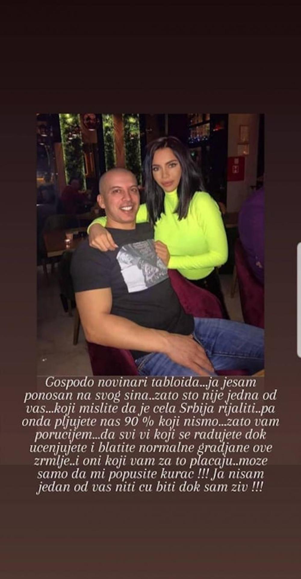 - Gospodo, novinari tabloida... Ja jesam ponosan na svog sina...zato što nije jedna od vas koji mislite da je cela Srbija rijaliti, pa onda pljujete nas 90 odsto koji nismo. Zato vam poručujem da svi vi koji se radujete dok ucenjujete i blatite normalne građane ove zemlje možete samo da mi popu*ite ku*ac! Ja nisam jedan od vas, niti ću biti dok sam živ! - napisao je Topalko uz sliku sa ćerkom Helenom.
