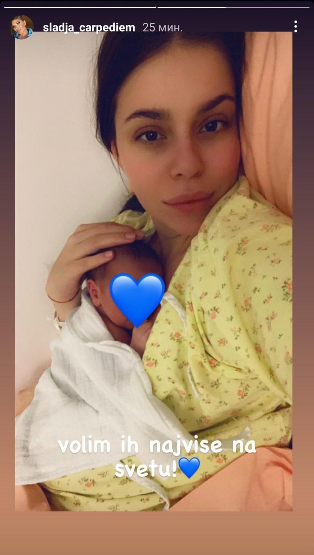 Lepa Nina u naručju, na grudima, drži tek rođenog sina uvijenog u pelenu, a ponosna baka je poručila: "Volim ih najviše na svetu".