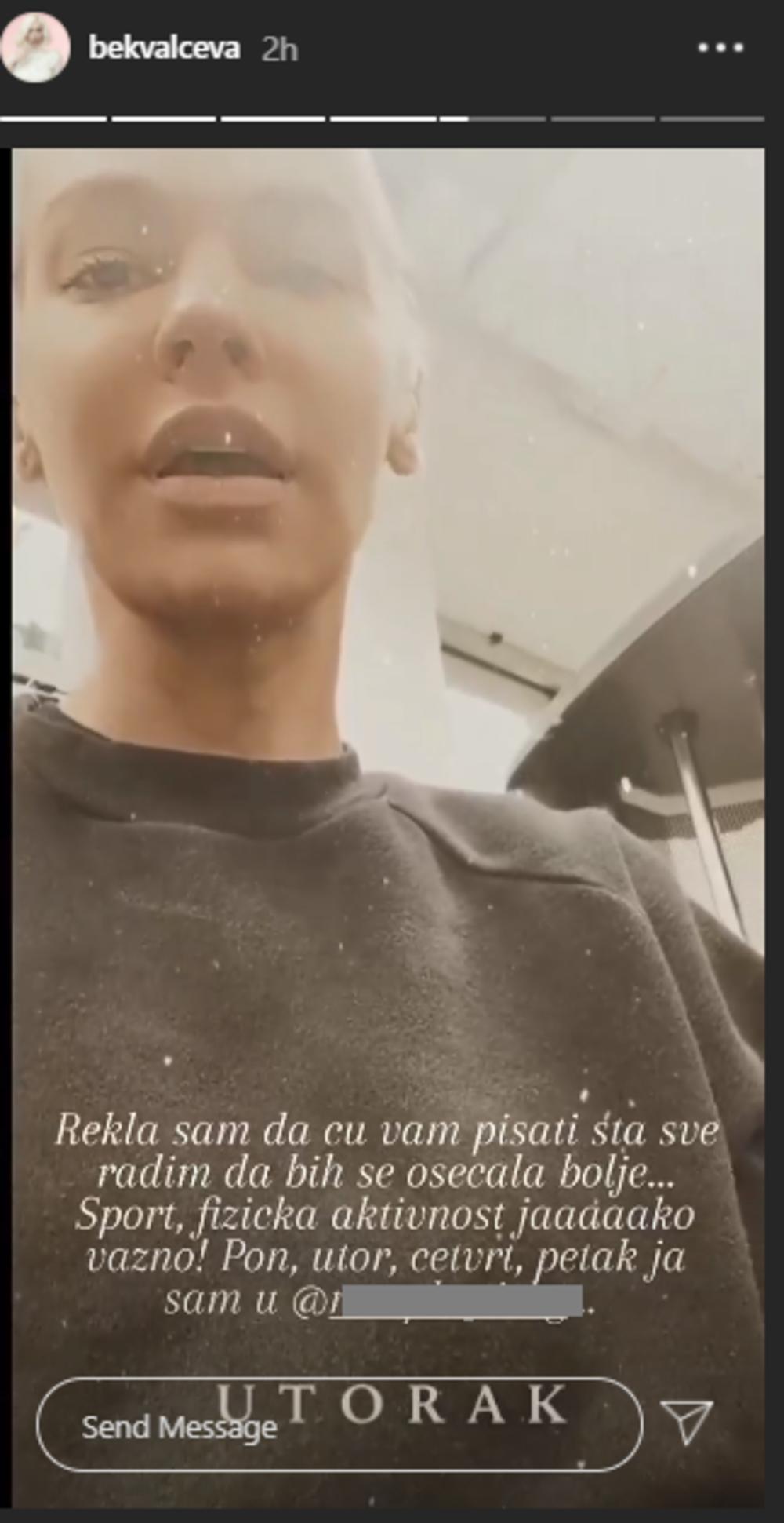 - Ne gledam vreme kada ću postaviti bilo šta na svoj Instagram. Ne vodim računa koliko često to radim. Brišem samo jako nepristojne komenare tužnih i besnih. Volim da komuniciram sa vama, ovo je jedina društvena mreža koju koristim. Rekli su mi da me uglavnom prate žene... Većina kažu... I posebni muškarci... Pitate me često kako se negujem, kako moje lice tako izgleda, da li vežbam, kako sam uvek tako nasmejana... Već neko vreme ne ulepšavam ništa u svom životu, čak ni na Instagram fotografijama i snimcima... Tako je, kako je. Savršeno ne postoji, zato sam odlučila da vam u narednih nekoliko dana otkrijem svoje tajne. Upoznam sa svim ljudima koji mi pomažu da budem dobro. Sa svojim timom. Upoznaću vas sa najboljima u svojim profesijama... I ne zaboravite... Lepota dolazi iznutra... Ne postoji šminka ni maska koja može sakriti nezadovoljstvo, tugu, bes. Imati svog psihijatra, psihologa, thetha healing ili reiki učitelja je (što bi moja baba rekla) POD MORALNO... Krećem da vam pišem od sutra, ovo nije reklama već moja želja da pomognem da se svaka od vas u ova teška vremena oseća što bolje u svojoj kozi. Volim vas zene - poručila je Bekvalčeva na svom profilu juče.