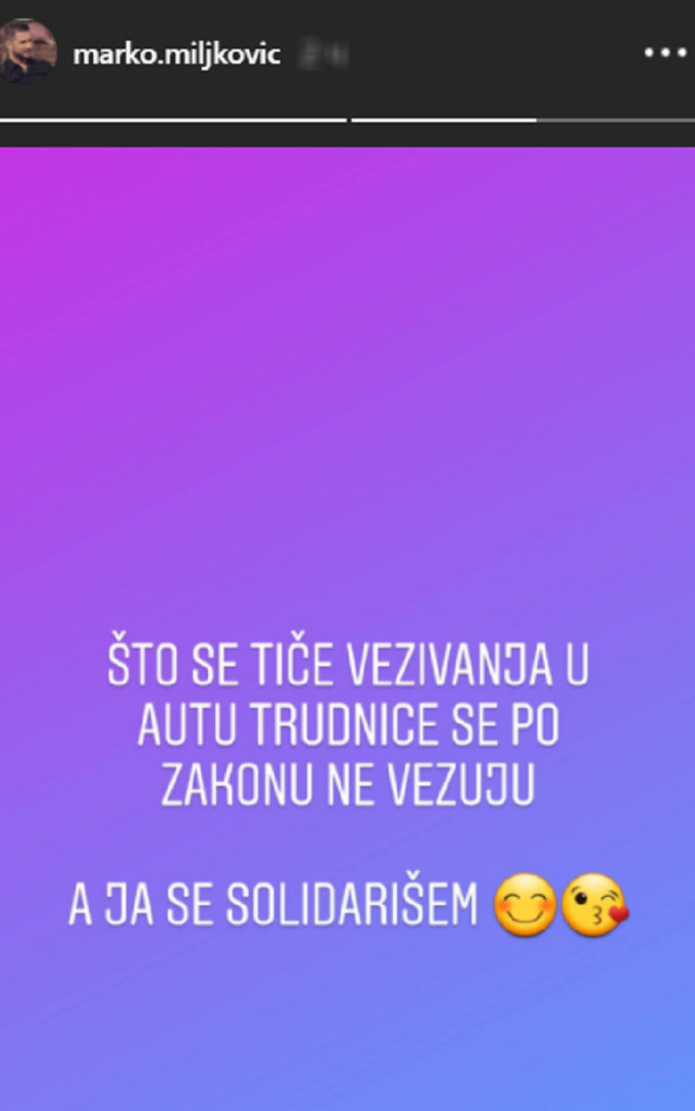 "Što se tiče vezivanja u autu, trudnice se po zakonu ne vezuju, a ja se solidarišem", napisao je Marko.