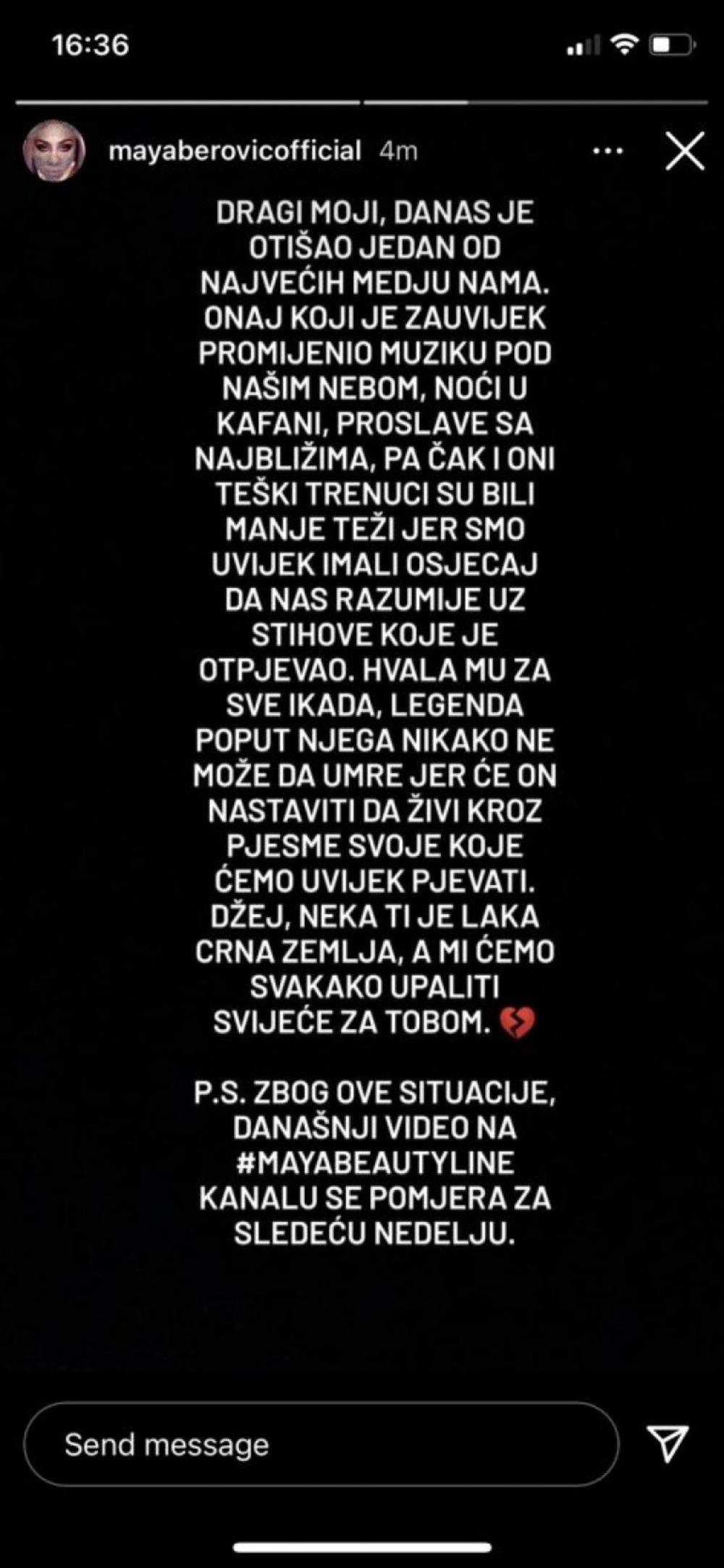 Pevačica Maja Berović ne može da dođe sebi od tuge zbog ove tragične, a od folkera se javno oprostila i putem društvenih mreža.