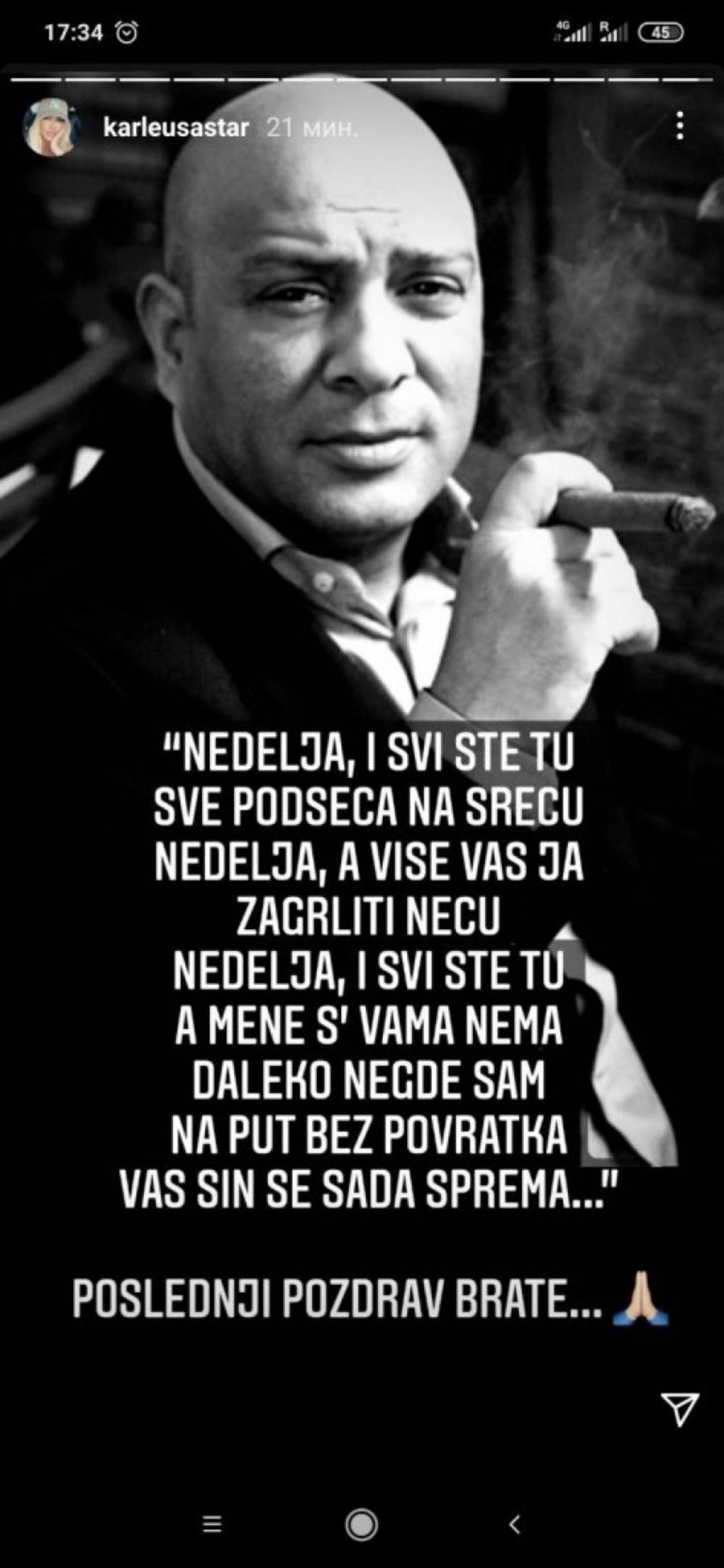 Pevačica Jelena Karleuša emotivnim rečima oprostila se od dragog kolege. Ona je objavila stihove njeogovog velikog hita "Nedelja", a zatim napisala: