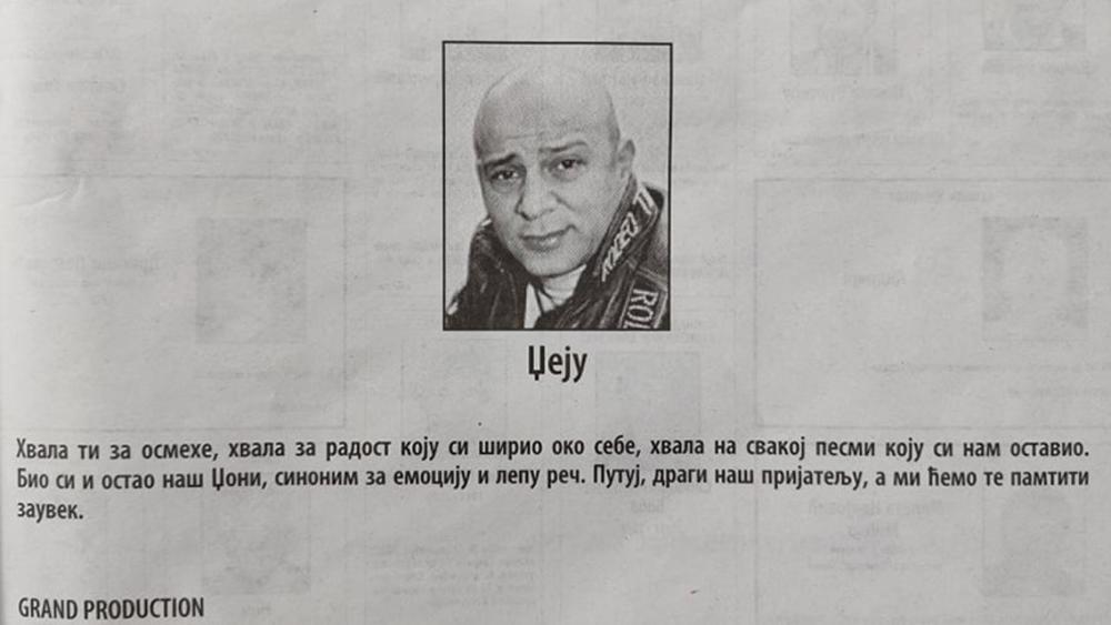 “Hvala ti za osmehe, hvala za radost koju si širio oko sebe, hvala na svakoj pesmi koju si nam ostavio. Bio si i ostao naš Džoni, sinonim za lepu reč. Putuj, dragi naš prijatelju, a mi ćemo te pamtiti zauvek”, stoji u čitulji “Grand produkcije” posvećenoj Džeju.