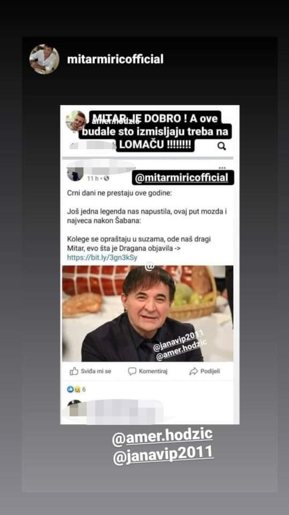 - Čime se sve ljudi služe, strašno! Mitar je živ i zdrav. Ovo je lažna vest! Sad ćemo malo da se igramo na sudu sa ovima koji objavljuju lažne vesti. Ne može nam niko ništa - glasi odogovor PR tima Mitra Mirića na njegovoj zvaničnoj stranici na Fejsbuku.