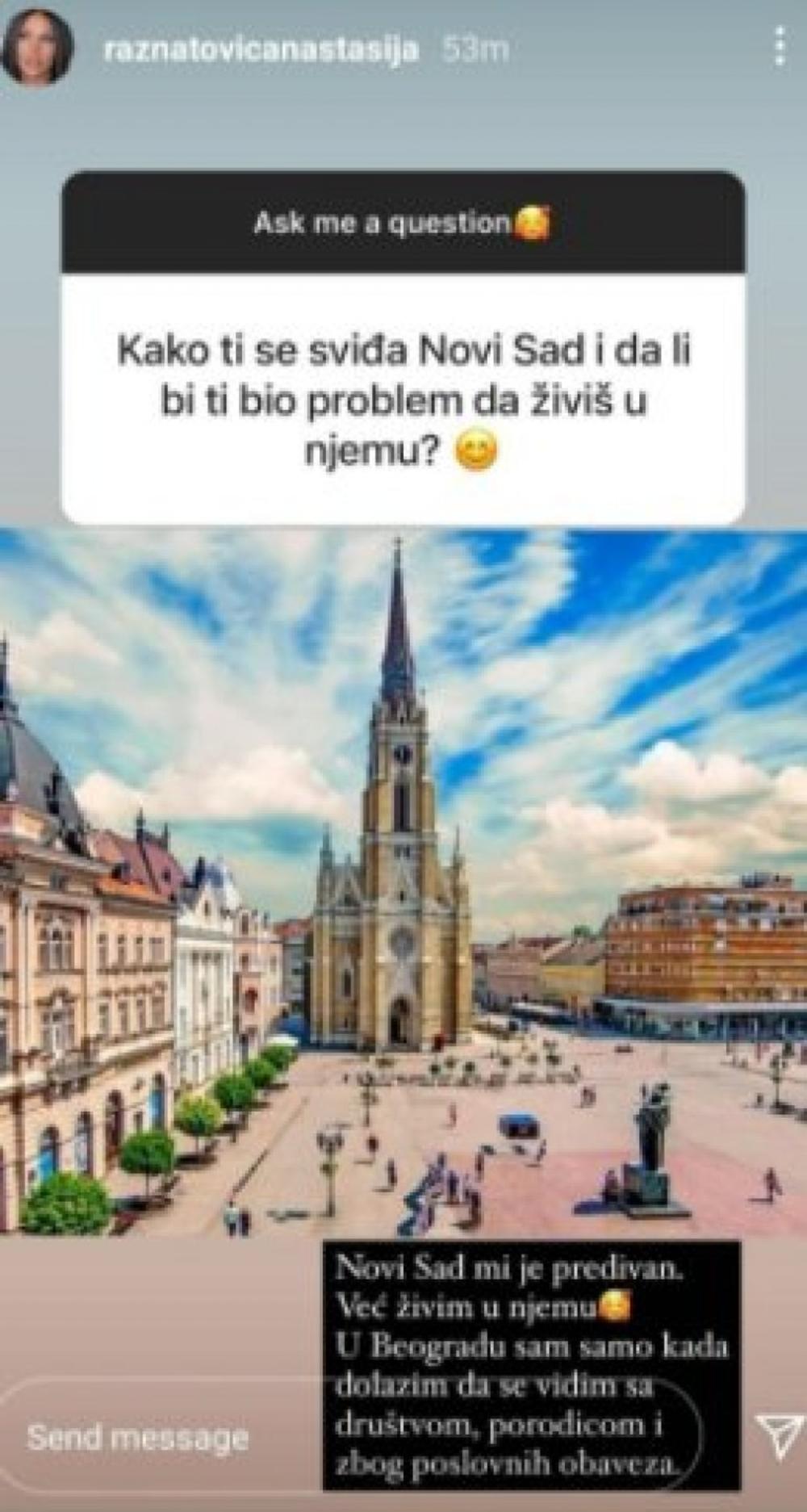 - Novi Sad mi je predivan. Već živim u njemu. U Beogradu sam samo kada dolazim da se vidim sa porodicom, društvom i zbog poslovnih obaveta - napisala je Ražnatovićeva.