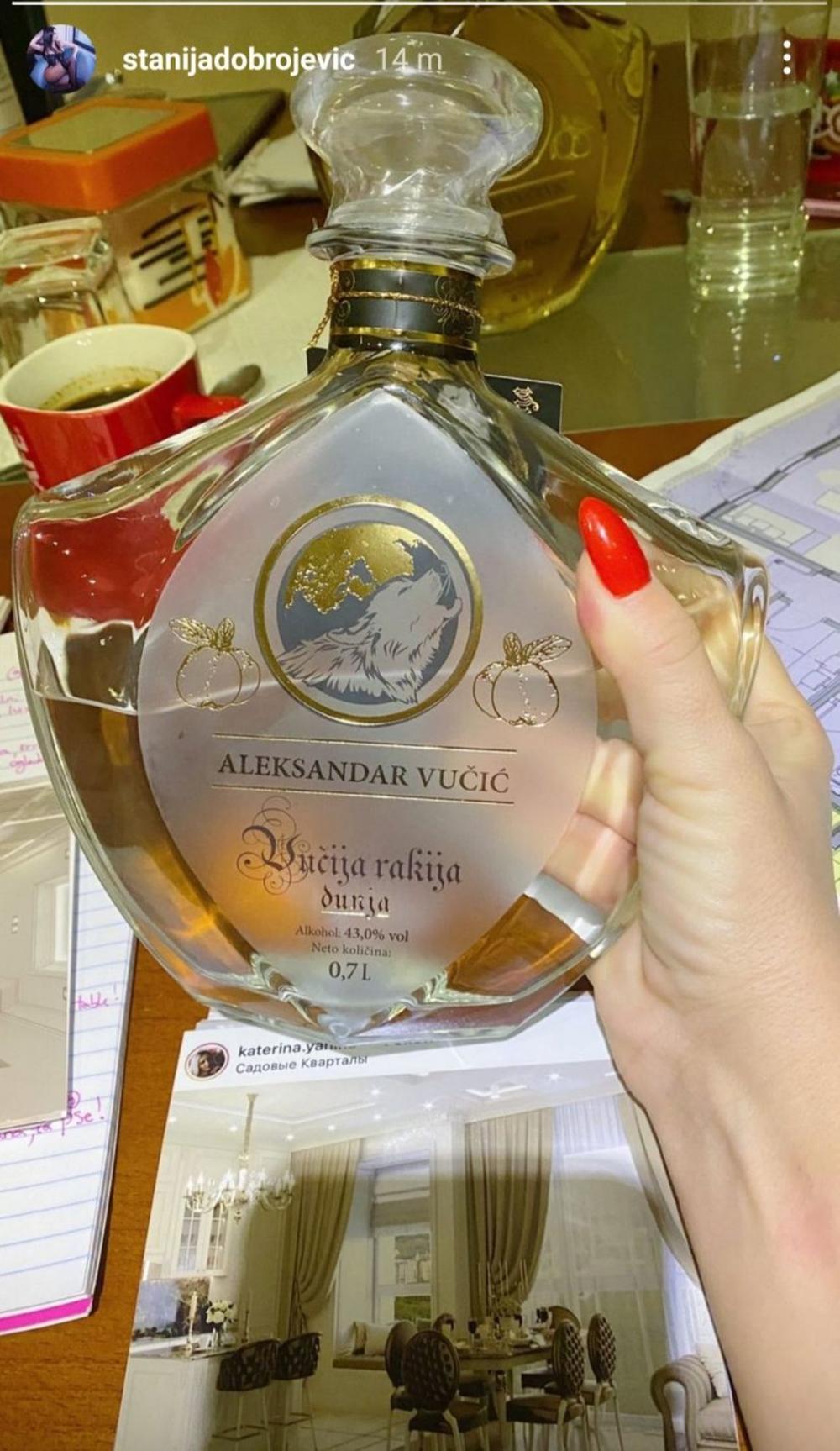 Naime, na slici se vidi kako nekadašnja učesnica "Zadruge" u ruci drži flašu rakije na kojoj piše Aleksandar Vučić.