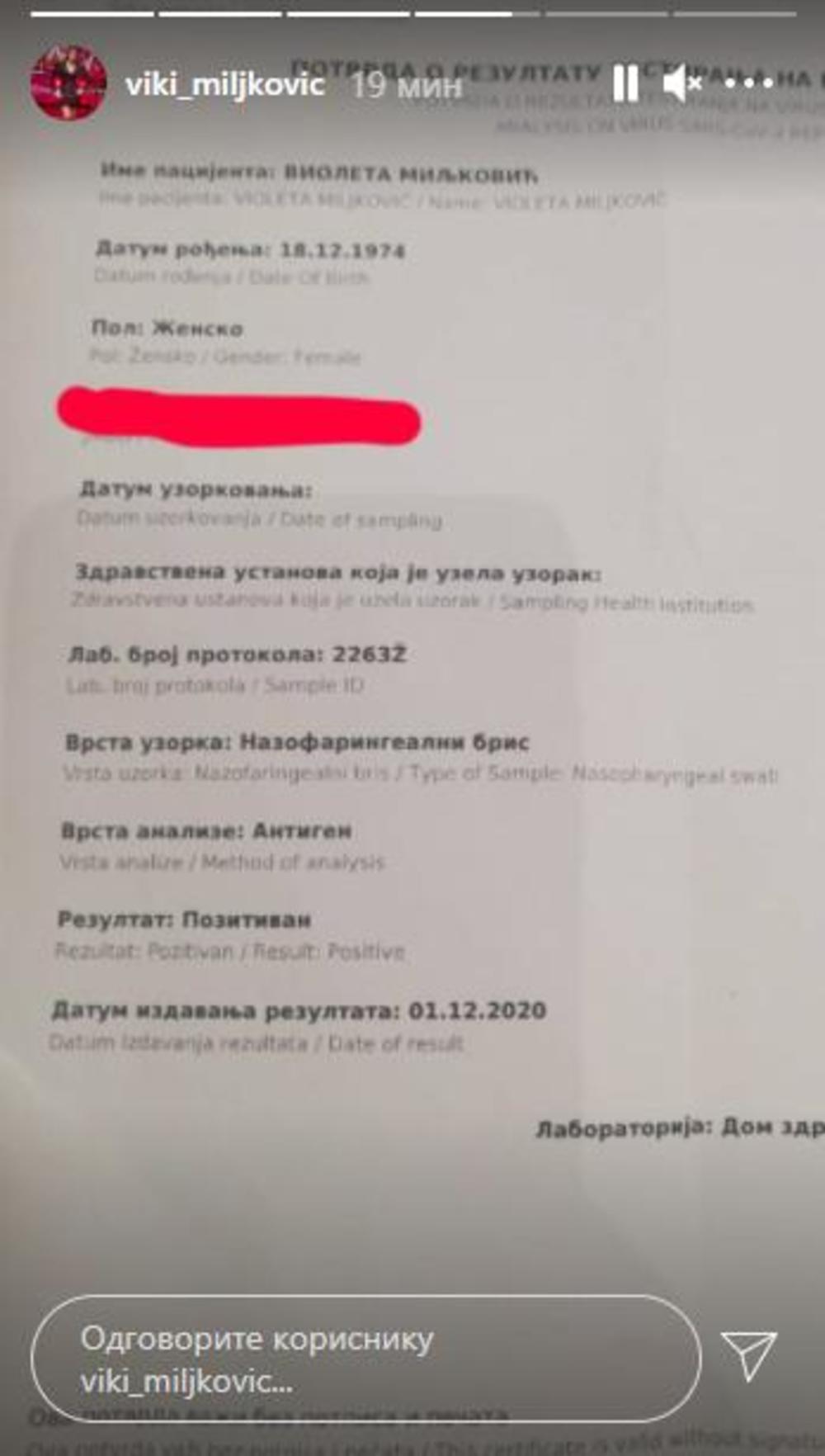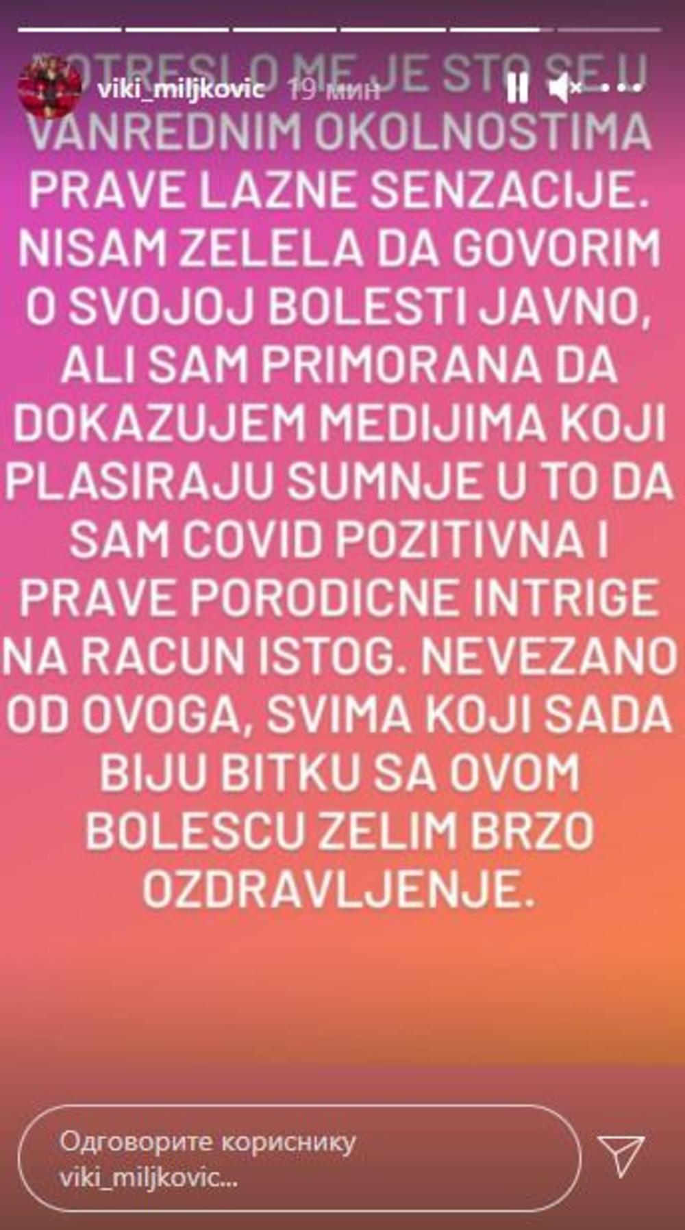 Nevezano od ovoga, svima koji sada biju bitku sa ovom bolešću, želim brzo ozdravljenje - napisala je Viki na Instgram storiju, pa objavila i pozitivan rezultat testa