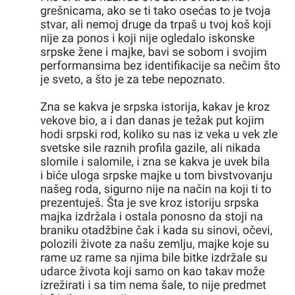 - Vidim, sjatila se gomila šatro patriota, kik boksera iz haustora, ološa, propalih fudbalera i ostale bagre, pa muški, po dobrom starom običaju napadaju jednu ženu. Zapamtite moje reči, najgora srpska bagra je upravo ona koja se krije iza lažnog patriotizma, vere i skaradnih tetovaža! Preci im sestide tih pi*ki koji javno napadaju žene! Kosti im se prevrću! - napisala je Jelena i dodala: