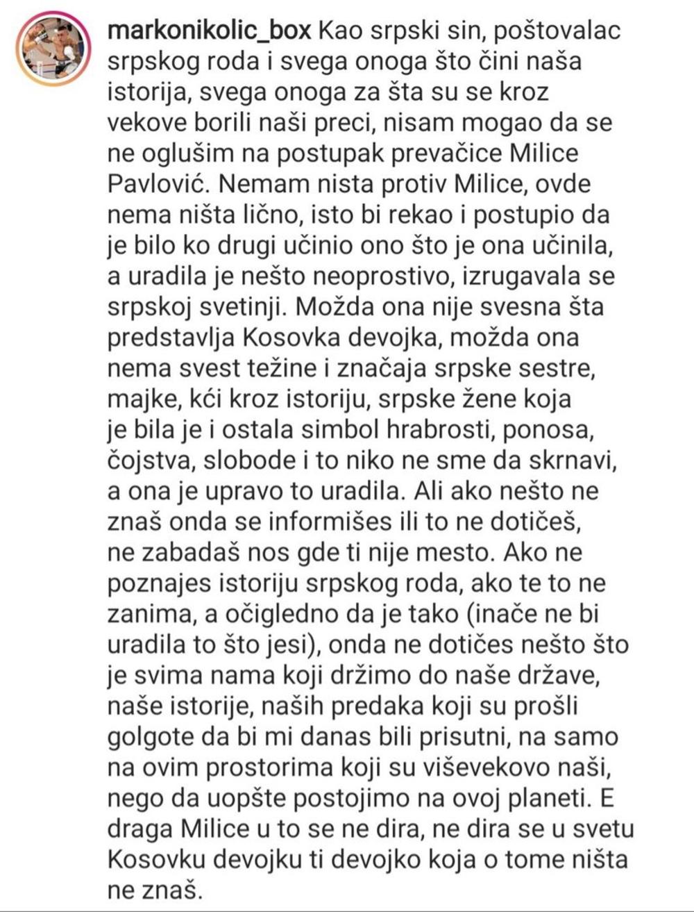 Inače, bokser Marko Nikolić je na svom Instagram profilu prethodno komentarisao Miličnin spot i Kosovku devojku 21. veka.