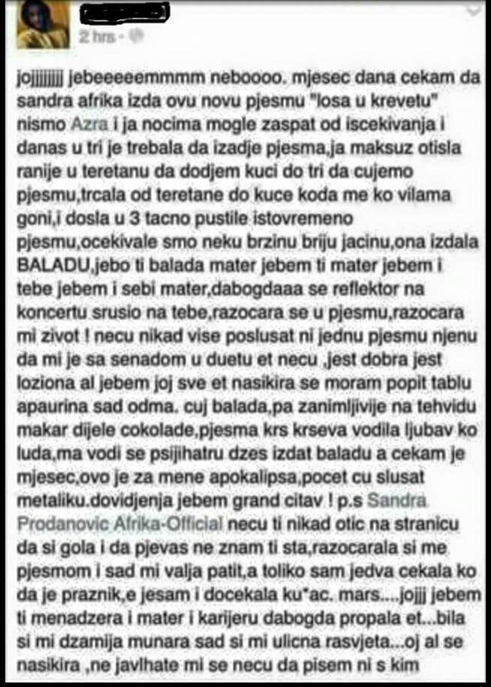 A kako je pesma o tome kako je Sandra Afrika mesec dana vodila ljubav kao luda, obožavateljka joj poručuje da ode kod psihijatra i da će promeniti muzički ukus i početi da sluša Metaliku.