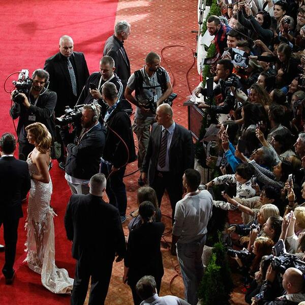 - Maja, moja partnerka iz televizije, i ja smo radili zajedno tu emisiju a onda su nas angažovali da radimo Red carpet, tj. ceremoniju Crvenog tepiha na Sarajevo film festivalu koji je izrastao u najveći filmski festival ne samo bivše Jugoslavije nego i ovog dela Evrope i to je zaista sjajna smotra u Sarajevu, kada dođu svi poznati, sa svih strana i skupi se ceo region jer je super atmosfera. Neki tu dolaze možda manje zbog filma, više zbog zabave. To što smo koleginica i ja radili su žive emisije, jedini smo imali privilegiju da ekskluzivno sa Crvenog tepiha dobijemo priliku za intervju na televiziji. Kao što vidite, tu su i Anđelina Džoli i Bred Pit i ne mogu ni opisati kako je to izgledalo. Do pre sat vremena pre početka festivala nije se ni znalo da će oni uopšte da dođu, tu informaciju smo dobili iz hrvatskih medija što je bilo potpuno čudno, da mi u Sarajevu ne znamo da će oni da dođu. Kad smo čuli da dolaze, Maja i ja smo potpuno flipnuli, ali oni su bili dva najdivnija i najobičnija bića koje možete da zamislite. Naravno da vam ovo okruženje oko vas, deset hiljada ljudi koji su došli da ih vide, pritisak medija i kamera, podigne adrenalin do maksimuma, ali njih dvoje su to potpuno spustili i znam da mi je Anđelina rekla kako su mi super naočare i stvarno je bila sjajna. Ona je primala nagradu za životno delo a Bred je bio samo njena pratnja. Onda je ona ušla i kad su svi ušli, nekako je nestalo svega toga ispred. Kako smo ušli i mi unutra, Bred Pit je tu stajao sa cigaretom i čašom vina i onda smo tu sa njim stajali. Zamisli tu nadrealnu scenu, stojimo u hodniku, pijemo vino i ćaskamo sa Bred Pitom.