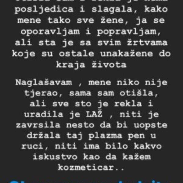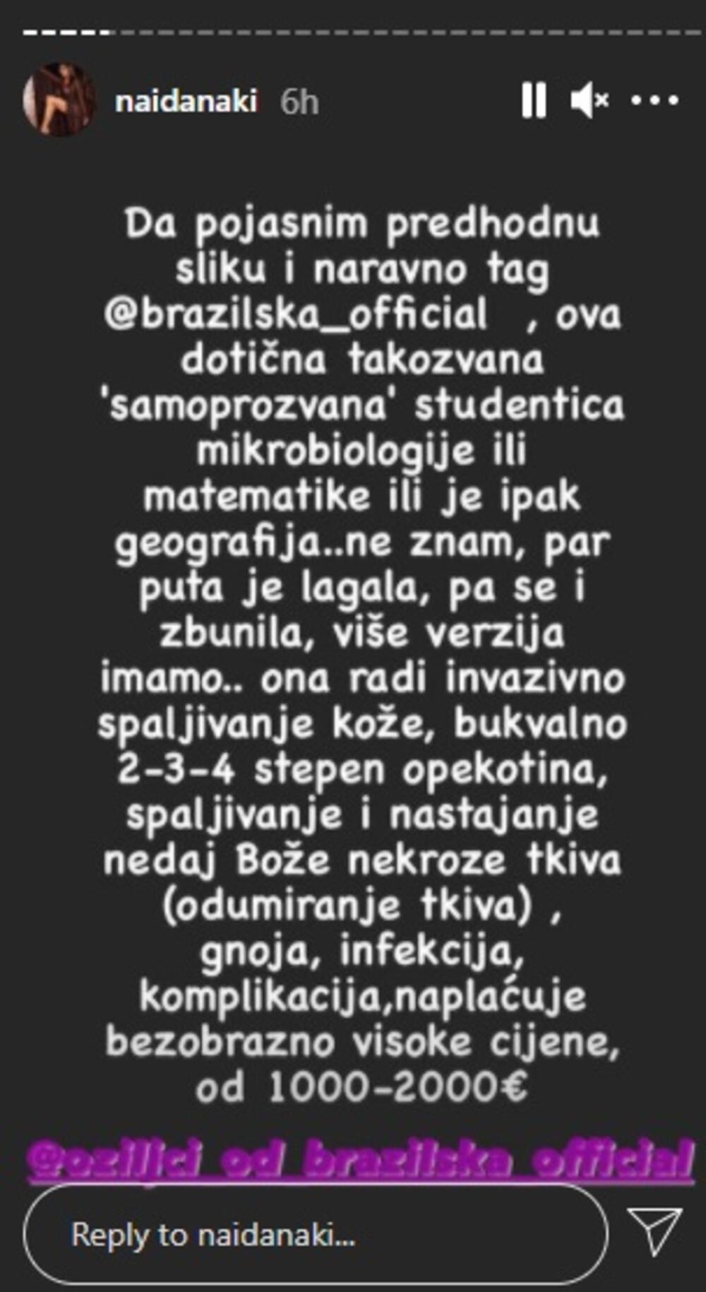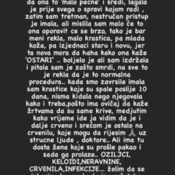 Da podsetimo, na Instagram profilu "Oziljci_od_brazilska_official" mogu se videti uznemirujuće slike žena koje su se podrgnule tretmanima u spornom salonu. Ove žrtve odlučile da upozore druge ljude, jer tvrde da su im od tretmana u jednom salonu ostali ožiljci, otoci, a sve zbog nestručnog rada.