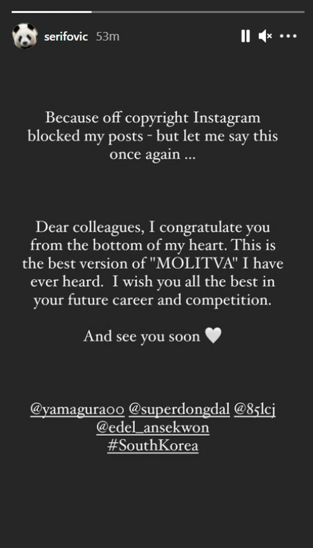 Kako je naglasila u objavi, zbog izvođačkih prava nije bila u mogućnosti da objavi snimak njihovog nastupa na svom Instagramu, ali je zato napisala predivnu poruku upućenu talentovanim Korejcima.