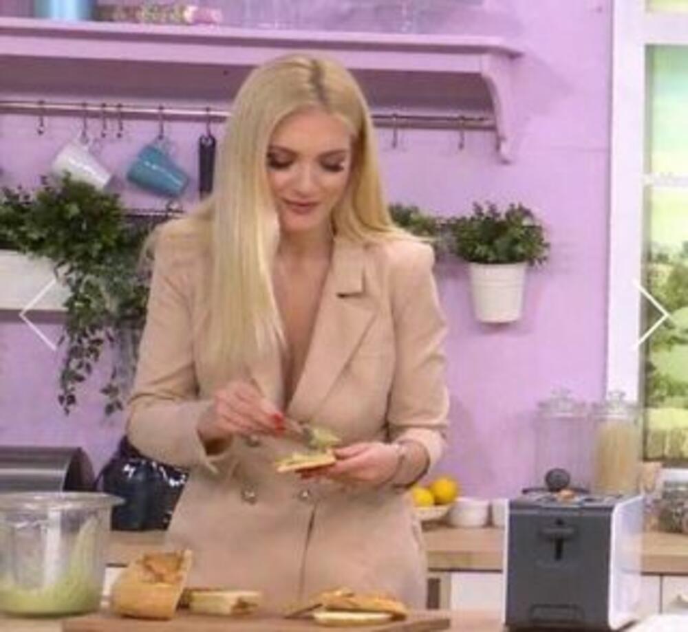 U emisiju "Praktična žena" na TV Prva došla je u krem odelu, a sako je bio prilično otvoren, pa je konstantno skretao pažnju sa onoga što je pevačica pripremala.