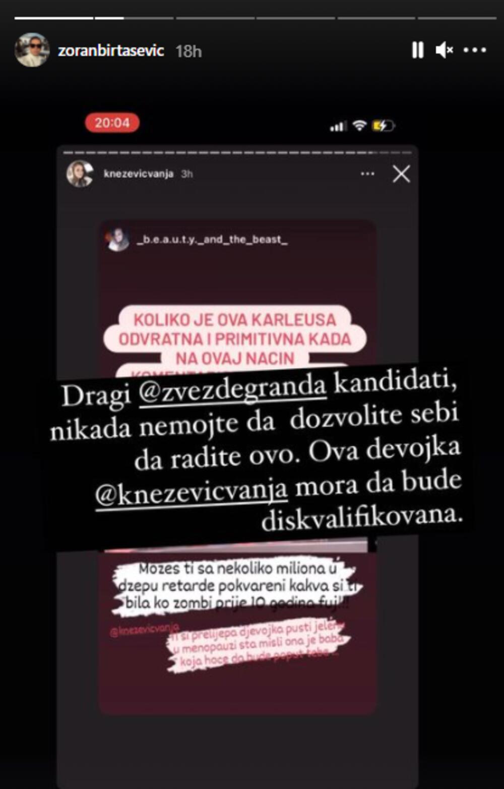 PR i dugogodišnji prijatelj pod dive Jelene Karleuše, Zoran Birtašević, rešio je da reaguje i obrati se produkciji "Zvezda Granda", povodom takmičarke Vanje Knežević, i zatraži da Kneževićevu diskvalifikuju, zbog toga što je nehotice ripostovala stori gde nepoznata osoba upućuje prozivke na Karleušin račun, a sve to iniciralo je kada je ona brutalno komentarisala Vanju, zbog čega se ona i rasplakala u toku emisije. Nakon toga, na društvenim mrežama se podigla velika prašina i usledili su lavina ogorčenih komenara gledala ovog muzičkog takmičenja.