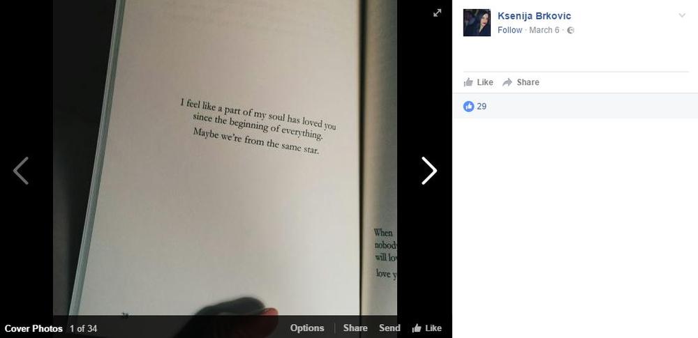 - Osećam kao da te je deo moje duše voleo od samog početka svega. Možda smo mi sa iste zvezde - glasi poslednji status koji je Ksenija ostavila na svom profilu na Fejsbuku.