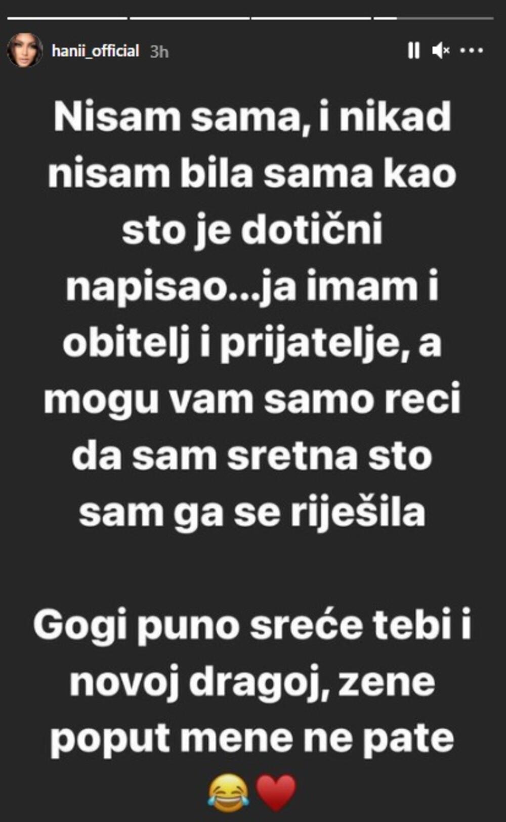 - Mi smo prekinuli prije dva tedna, kad sam ga ja ostavila, a do pre tri dana si me molio da ti se vratim. Tako da Gorane, prestani pričati, da ne bih ja počela - napisala je ljutito Hana.