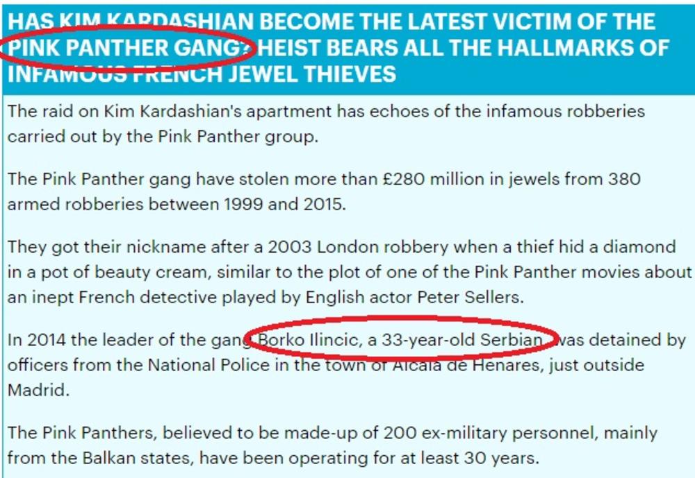 Naime, najpoznatiji britanski njuz portal Dejli Mejl objavio je i da je Kim poslednja žrtva čuvene bande Pink Panteri.