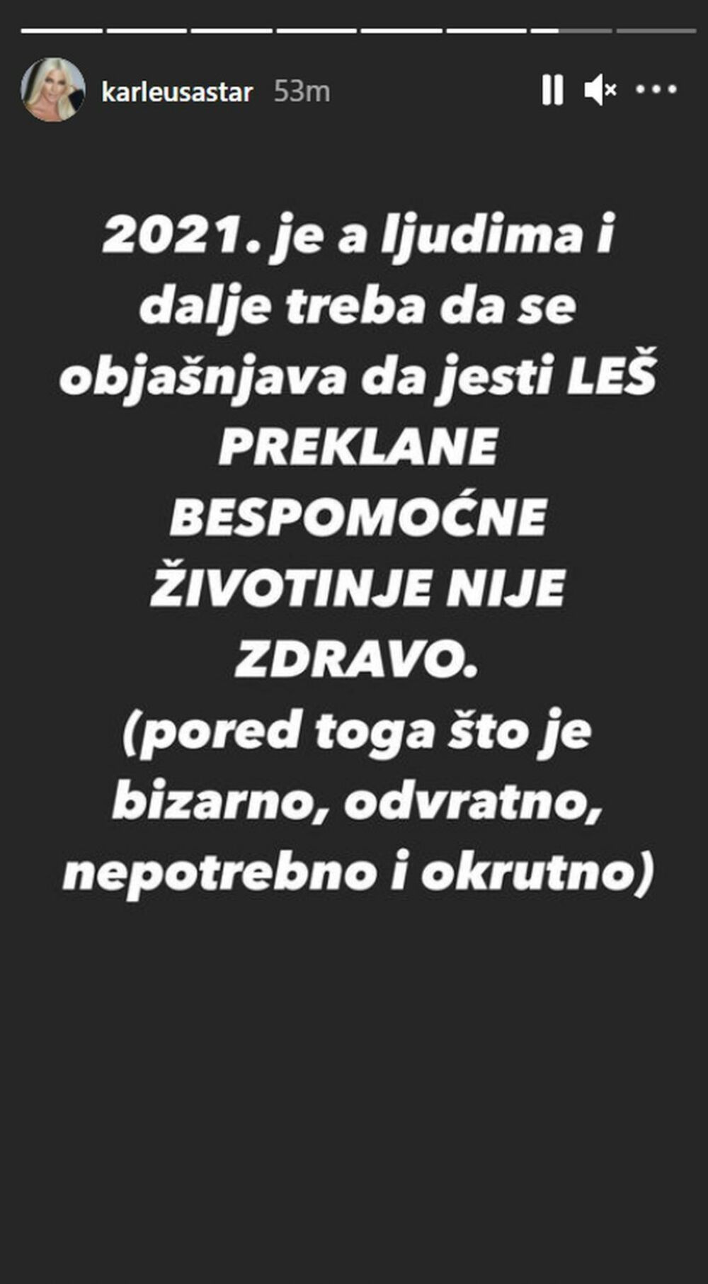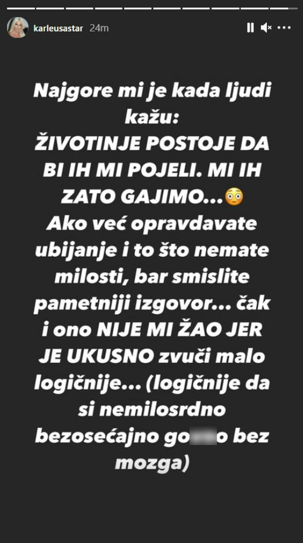 - Najgore mi je kada ljudi kažu: "Životinje postoje da bi ih mi pojeli. Mi ih zato gajimo". Ako već opravdavate ubijanje i to što nemate milosti, bar smislite pametniji izgovor. Čak i ono "nije mi žao jer je ukusno", zvuči malo logičnije. Logičnije da si nemilosrdno, bezosećajno, go*** bez mozga - napisala je Jelena.