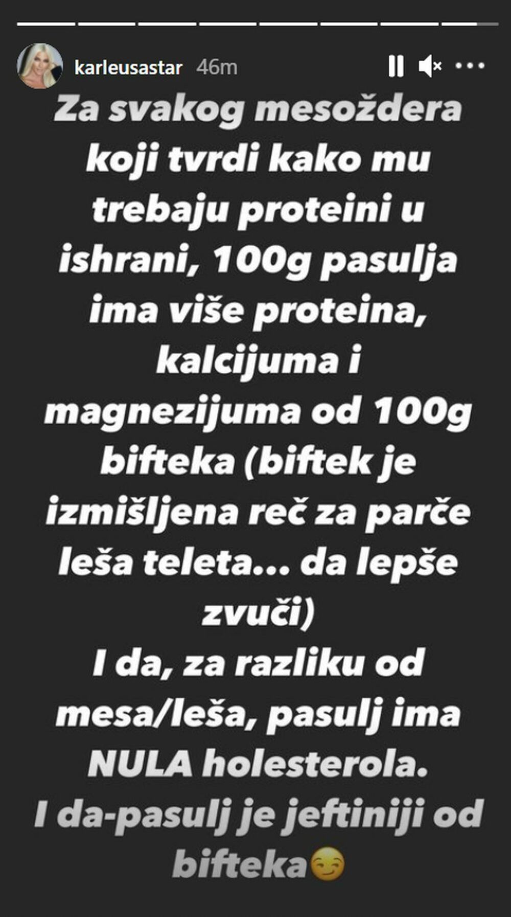 KARLEUŠA OBJASNILA ZAŠTO JE PASULJ BOLJI OD BIFTEKA, PA ŽESTOKO PORUČILA: Mesožderi, NE JEDITE LEŠEVE!