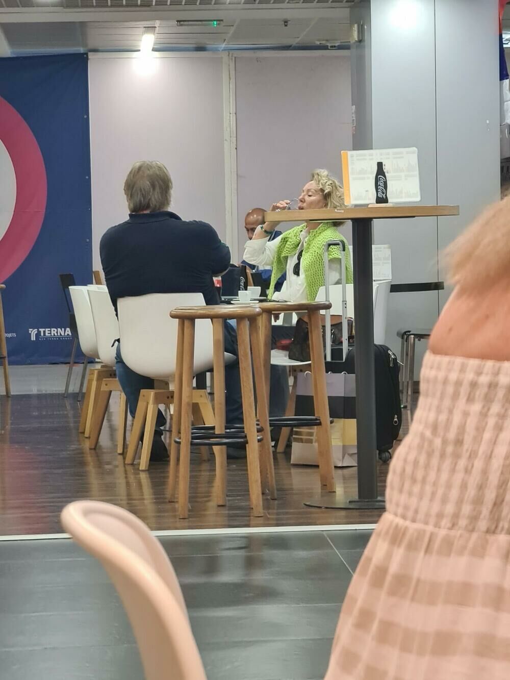 Brena i Boba su ostali da sede, čekajući svoj let za Crnu Goru, a za to vreme su gledali u telefone, pili vodu i razmenili poneku reč. Izgleda da ih je prilično umorilo čekanje, što se može zaključiti i po njihovim sumornim licima.