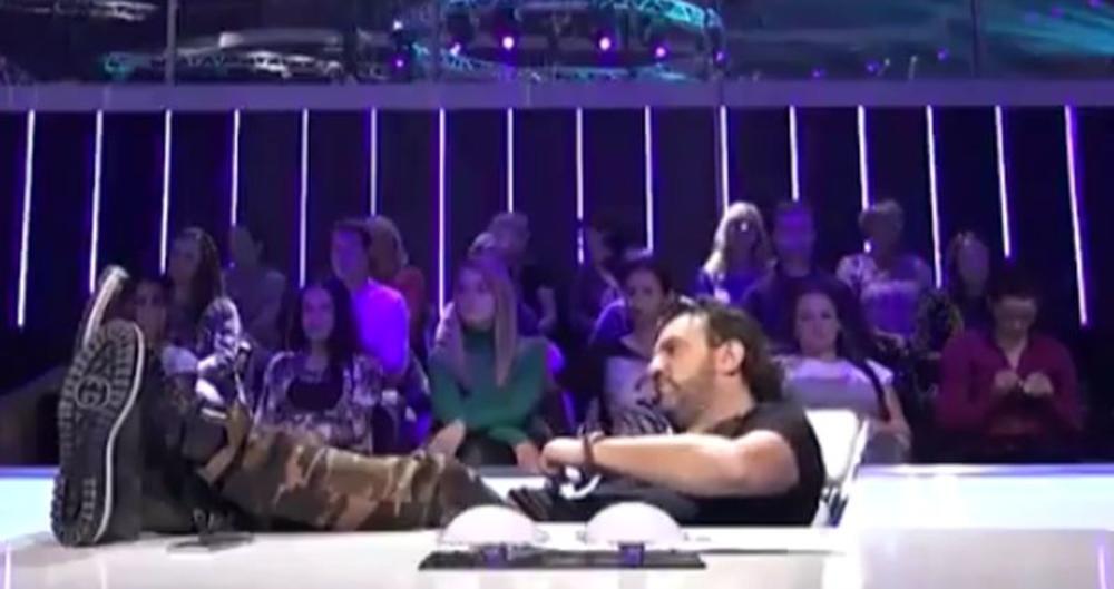 Dok je jedna kandidatkinja izvodila svoju numeru on je sedeći na stolici podigao obe noge na sto, zatim ih raširio, a u sledećem trenutku pljusnuo svom snagom o pod.
