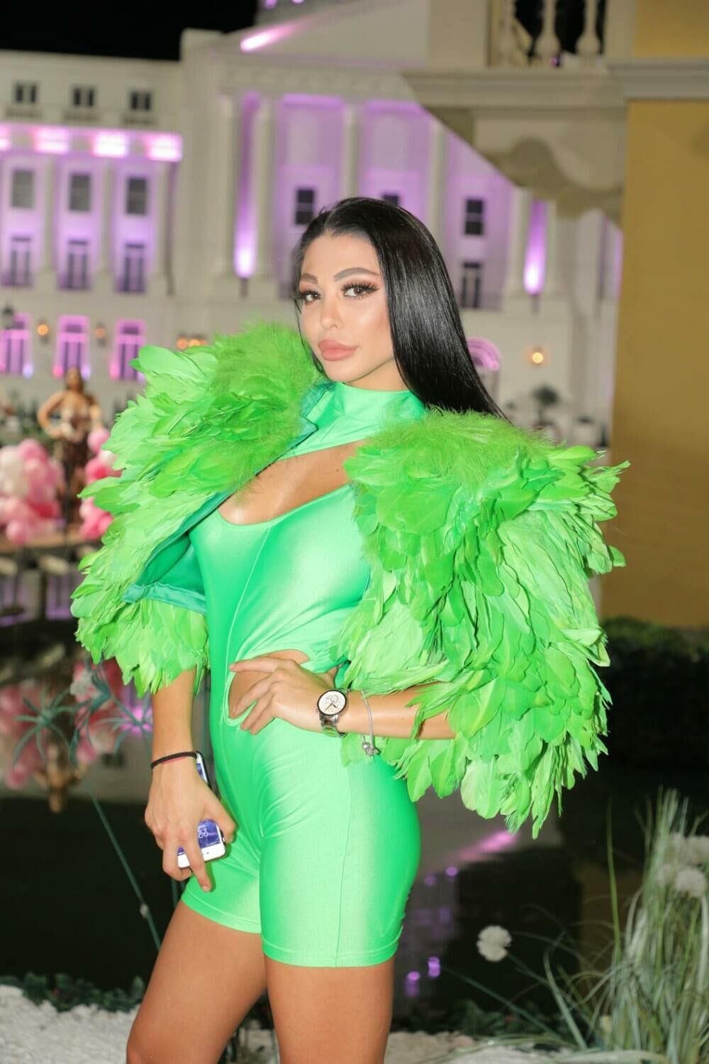 Maja se pojavila u zelenoj odevnoj kombinaciji, koja je podrazumevala veštačko perje i izreze kod intimnih delova tela.
