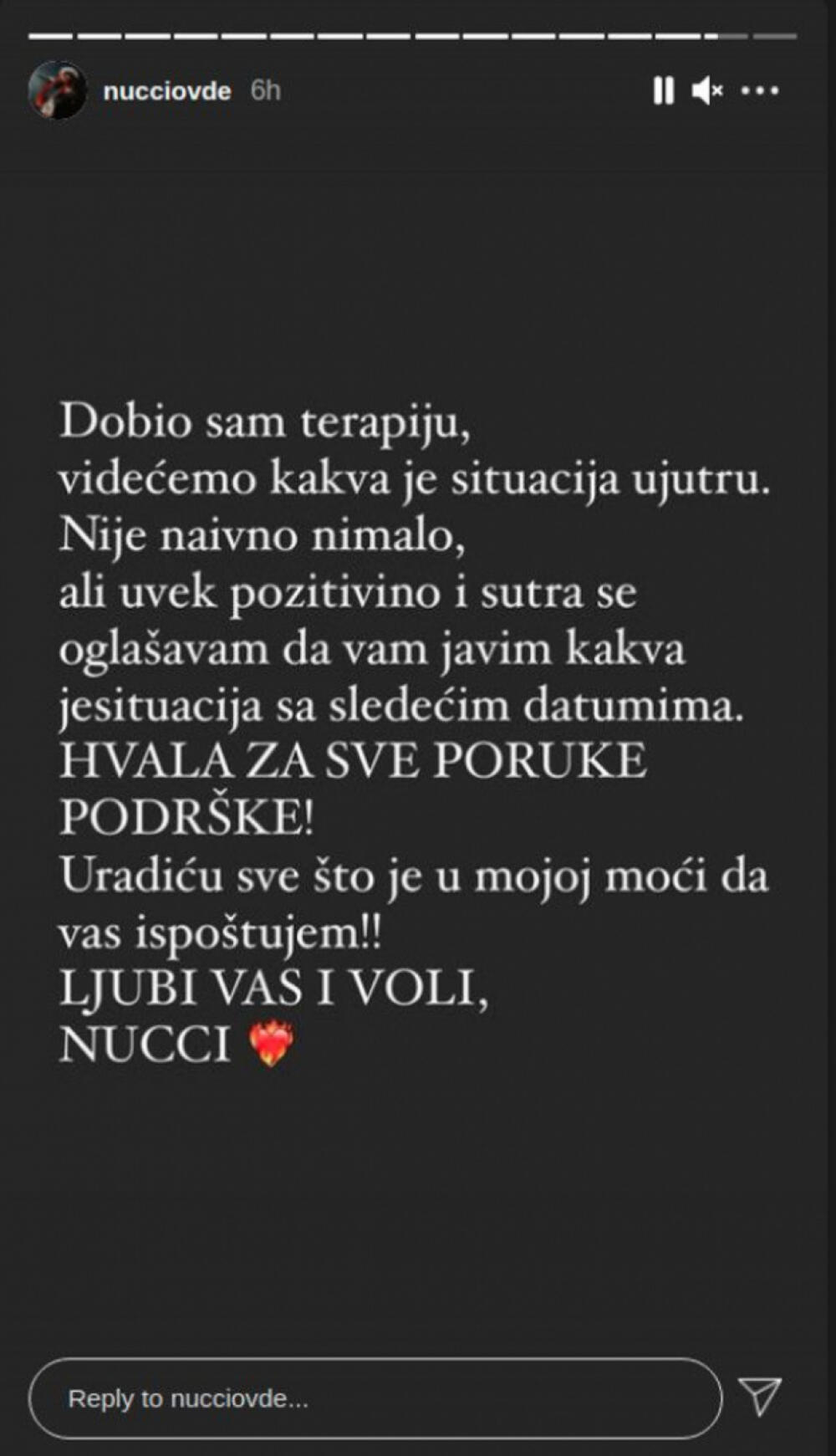 - Dobio sam terapiju! Videćemo kakva je situacija ujutru. Nije naivno ni malo, ali samo pozitivno i sutra se oglašavam da vam javim kakva je situacija sa sledećim datumima. Hvala za sve poruke podrške. Uradiću sve što je u mojoj moći da vas ispoštujem! Ljubi vas i voli Nucci - napisao je reper na svom Instagram profilu, pa postavio snimak na kojem se vidi momenat kako sedi na bini povređen.