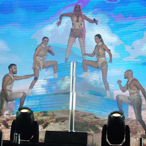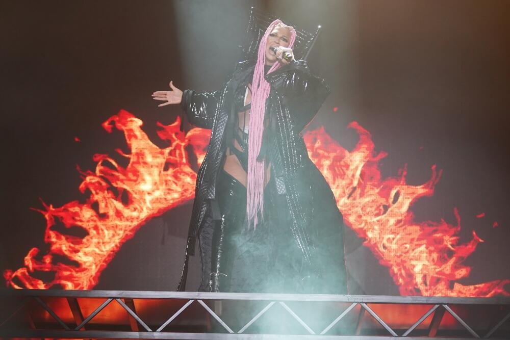 Na sceni se prvobitno pojavila u bodiju boje kože koji je na kukovima imao lance, dok je njena kosa ofarbana u roze i ispletena u kikice do kolena sve raspametila. U drugom bloku, pevačica se presvukla u crni uski bodi od lateksa koji je malo toga sakrio, a u jednom trenutku je publici okrenula guzu u tangama i sve bacila u trans.