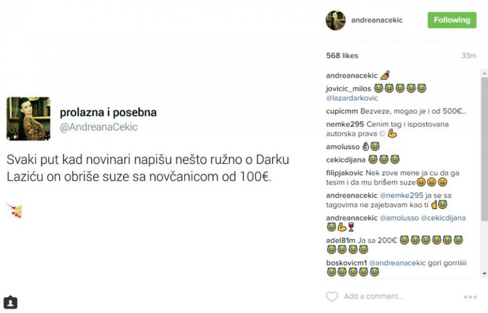 - Svaki put kad novinari napišu nešto ružno o Darku Laziću on obriše suze sa novčanicom od 100 evra, napisala je Andreana.