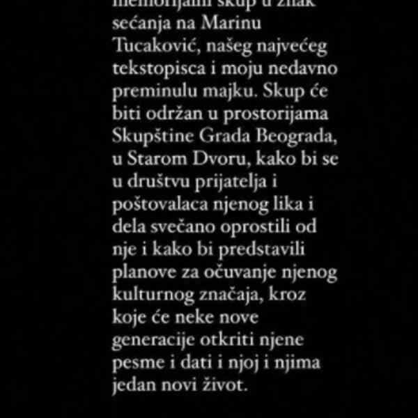 „24. novembra održaće se memorijalni skup u znak sećanja na Marinu Tucaković, našeg najvećeg tekstopisca i moju nedavno preminulu majku. Skup će biti održan u prostorijama Skupštine Grada Beograda, u Starom Dvoru, kako bi se u društvu prijatelja i poštovalaca njenog lika i dela svečano oprostili od nje i kako bi predstavili planove za očuvanje njenog kulturnog značaja, kroz koje će neke nove generacije otkriti njene pesme i dati i njoj i njima jedan novi život.“