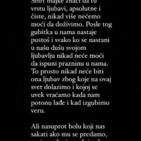 „Jedina bezuslovna ljubav je ljubav majke prema detetu. Smrt majke znači da tu vrstu ljubavi, apsolutne i čiste, nikad više nećemo moći da doživimo. Posle tog gubitka u nama nastaje pustoš i svako ko se nastani u našu dušu svojom ljubavlju nikad neće moći da ispuni prazninu u nama. To prosto nikad neće biti ona ljubav zbog koje na ovaj svet dolazimo i kojoj se uvek vraćamo kada nam potonu lađe i kad izgubimo veru.“