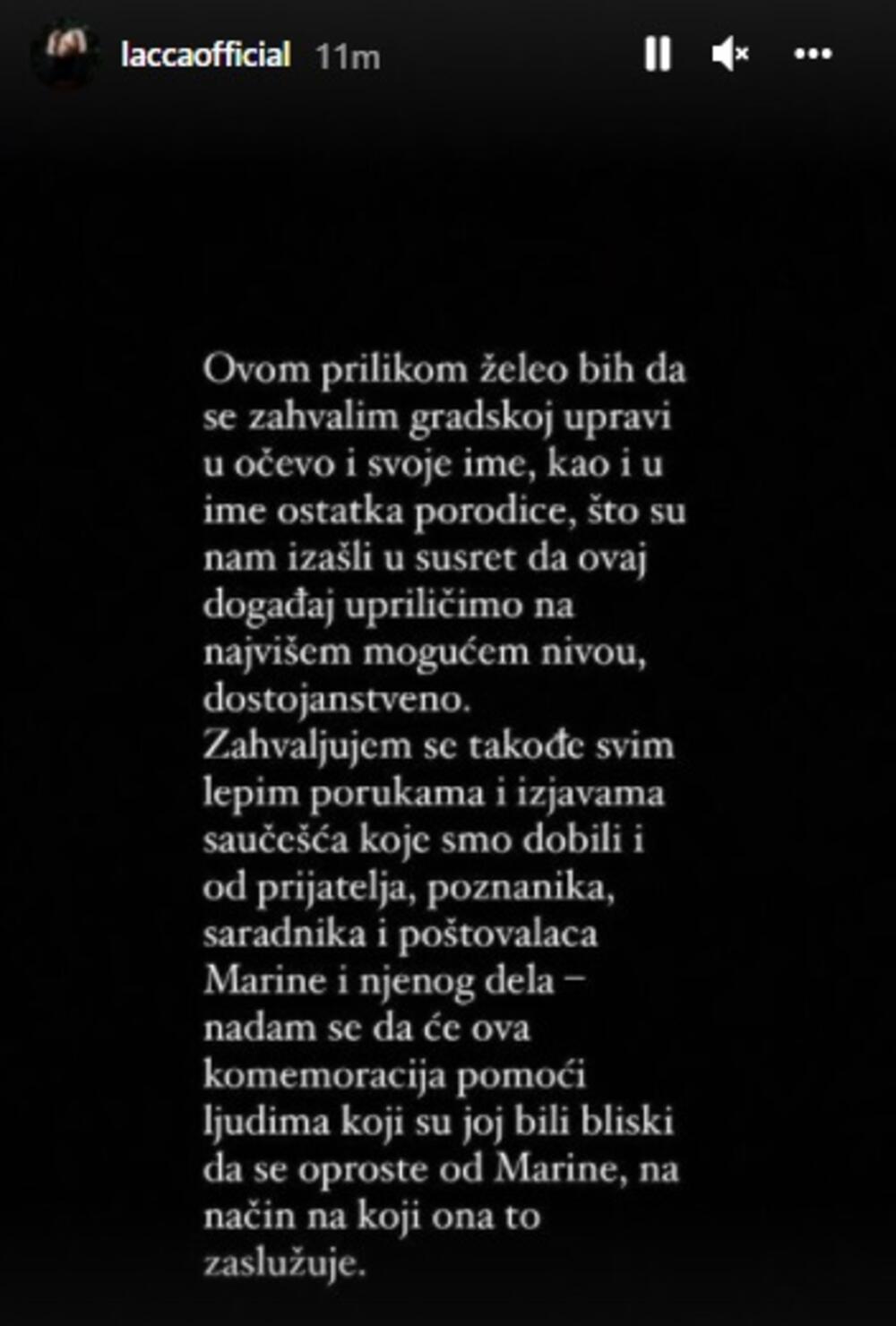 „Pozivnice će biti poslate u najkraćem mogućem roku, a mediji će naknadno biti obavešteni o svim detaljima u vezi sa skupom. Ovom prilikom želeo bih da se zahvalim gradskoj upravi u očevo i svoje ime, kao i u ime ostatka porodice, što su nam izašli u susret da ovaj događaj upriličimo na najvišem mogućem nivou, dostojanstveno. Zahvaljujem se takođe svim lepim porukama i izjavama saučešća koje smo dobili i od prijatelja, poznanika, saradnika i poštovalaca Marine i njenog dela – nadam se da će ova komemoracija pomoći ljudima koji su joj bili bliski da se oproste od Marine, na način na koji ona to zaslužuje.“