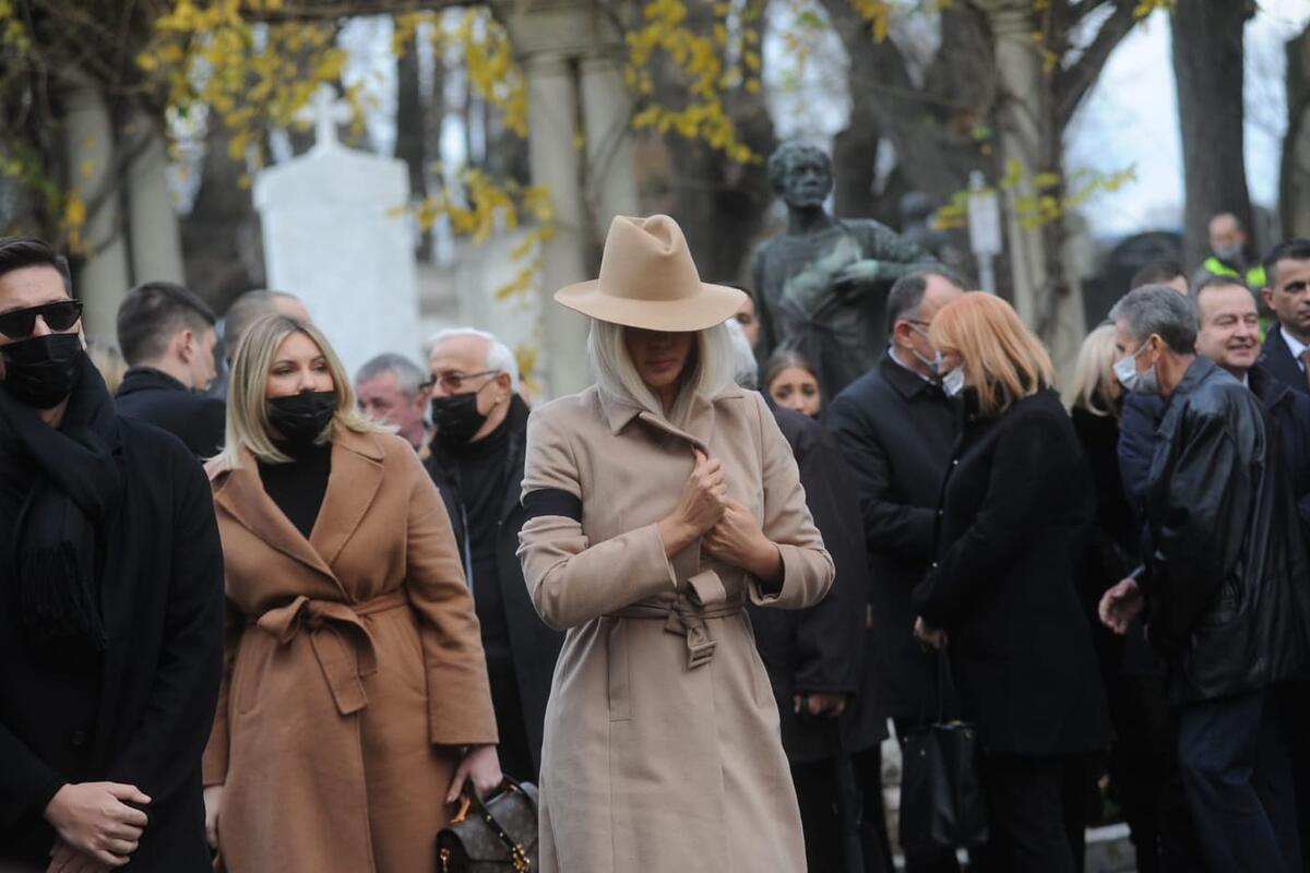 Karleuša je na sahranu došla u bež odevnoj kombinaciji, a ono što nikome nije moglo da promakne jeste flor na desnoj ruci u znak žalosti za pokojnim Mrkonjićem.