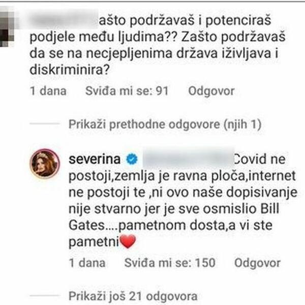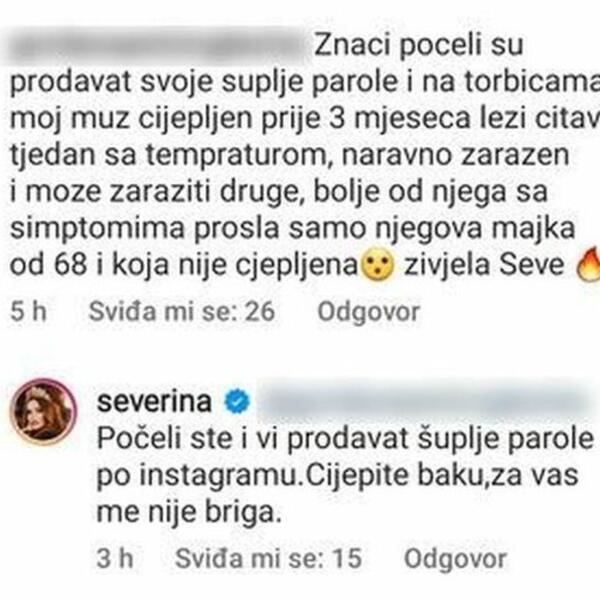- Počeli ste da prodajte šušlje parole po Instagramu. Vakcinišite baku, briga me je za vas - jedan je od Severininih odgovora.