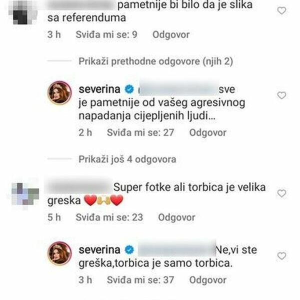 - Ne, vi ste greška, torbica je samo torbica - napisala je Severina.