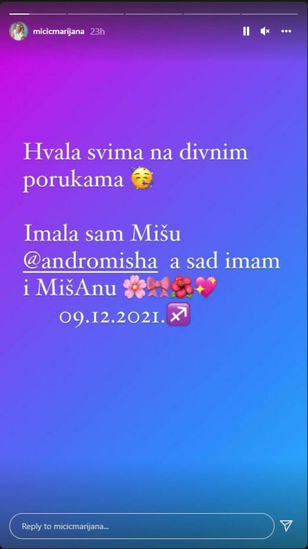 "Hvala svima na divnim porukama. Imala sam Mišu, a sad imam i MišAnu. 9.12.2021", napisala je glumica na Instagramu.