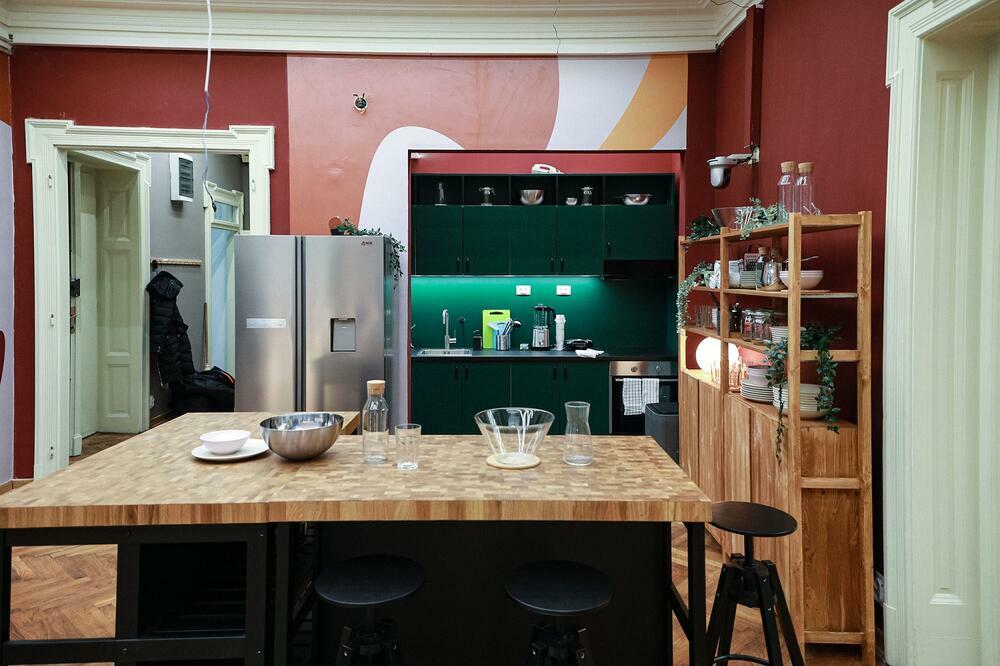 Čim se otvore vrata, ulazi se u hodnik, koji vodi do dva toaleta - muškog i ženskog. S desne strane je ulaz u veliku i prostranu kuhinju, opremljenu najmodernijim aparatima, a tu je i ogromna trpezarija s velikim stolom, za koji mogu da sednu svi stanari.