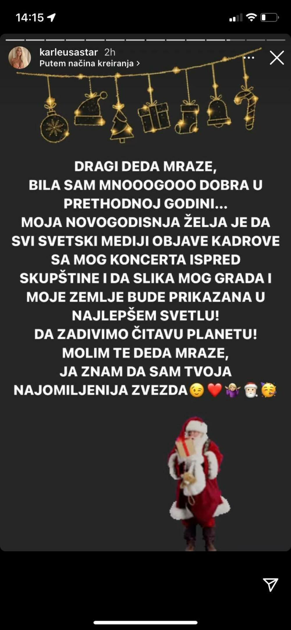 - Dragi Deda Mraze, bila sam mnogo dobra u prethodnoj godini. Moja novogodišnja želja je da svi svetski mediji objave kadrove sa mog koncerta ispred Skupštine i da slika mog grada i moje zemlje bude prikazana u najlepšem svetlu! Da zadivimo čitavu planetu! Molim te, Deda mraze, ja znam da sam tvoja najomiljenija zvezda - napisala je Karleuša.