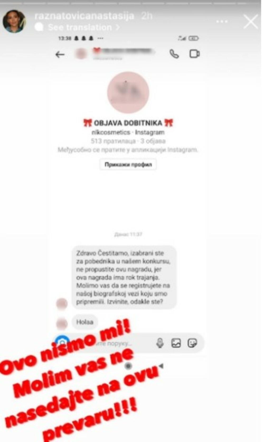 - Ljudi, ovo je prevara! Ko god da je dobio poruku ove sadržine treba da zna da to nije naša oficijalna stranica, već prevara. Ne nasedajte! Ne uplaćujte novac! - napisala je Anastasija.