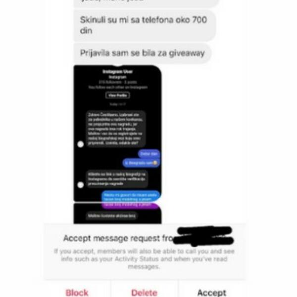Naime, radi se o tome da ljudima na Instagramu stižu poruke da kliknu na određeni link, kako bi preuzeli nagradu usled giveaway-a, a onda im se skida novac.
