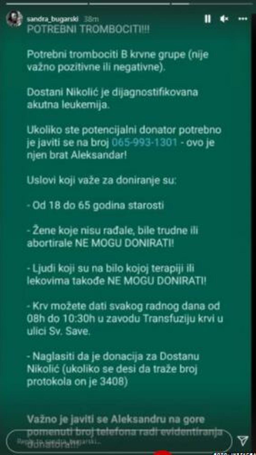 - POTREBNI TROMBOCITI! Dostani Nikolić je dijagnostifikovana akutna leukemija. Ukoliko ste potencijalni donor, potrebno je javiti se na 0659931301 - ovo je broj njenog brata Aleksandra. Uslovi koji važe za donaciju su: od 18 do 65 godina starosti, žene koje nisu rađale, bile trudne ili abortirale NE MOGU DONIRATI, ljudi koji su na bilo kojoj terapiji ili lekovima NE MOGU DONIRATI, krv možete dati radnog svakog dana od 8h do 10:30 h u zavodu za Transfuziju krvi u ulici Sv. Save. Naglasiti da je donacija za Dostanu Nikolić (ukoliko se desi da traže broj protokola, on je 3408. Važno je javiti se Aleksandru na gore pomenuti broj telefona radi evidentiranja donatora - podelila je Sandra Bugarski na svom Insgrama "storiju".