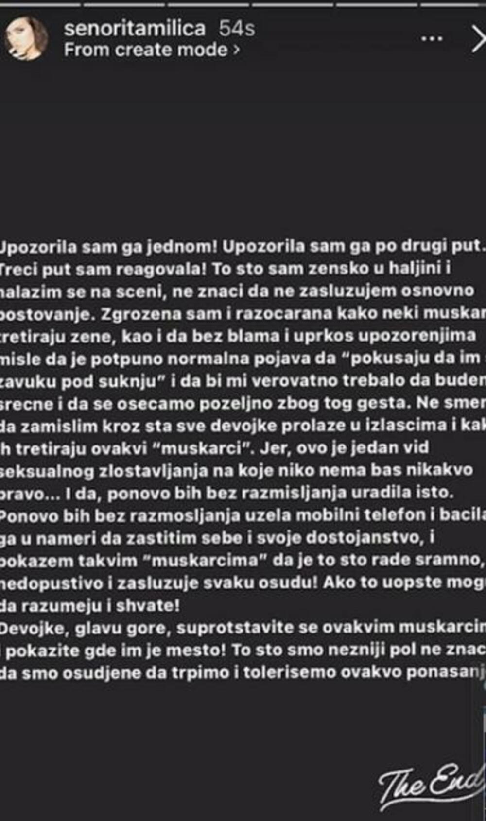 - Upozorila sam ga jednom, upozorila sam ga drugi put. Treći put sam reagovala. To što sam žensko u haljini i nalazim se na sceni ne znači da ne zaslužujem osnovno poštovanje . Zgrožena sam i razočarana kako neki muškarci tretiraju žene, kao i da bez blama i uprkos upozorenjima misle da je potpuno normalna pojava da "pokušavaju da im se zavuku pod suknju" i da bi mi verovatno trebalo da budemo srećne i da se osećamo poželjno zbog tog gesta. Ne smem da zamislim kroz šta sve devojke prolaze u izlascima i kako ih tretiraju ovakvi muškarci, jer ovo je jedan vid se***lnog zlostavljanja na koje niko nema baš nikakvo pravo. I da ponovo bih bez razmišljanja uradila isto. Ponovo bih uzela telefon i bacila ga u nameri da zaštitim sebe i svoje dostojanstvo i da pokažem takvim muškarcima da je to što rade sramno, nedopustivo i zaslužuje svaku osudu.